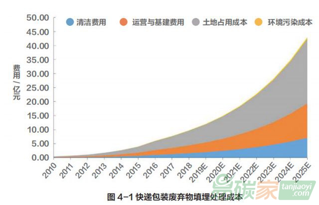 用此方法估算,平均每噸快遞垃圾填埋所需的處理費(fèi)用為 705 元,其中填埋場(chǎng)占用土地產(chǎn)生的成本最大。以2018 年為例,填埋 138.13 萬(wàn)噸快遞垃圾需垃圾處理費(fèi)用 9.74 億元,其中土地占用成本 5.22 億元、運(yùn)營(yíng)與基建費(fèi)用 2.79 億元、清運(yùn)費(fèi)用 1.61 億元,環(huán)境污染成本 1265 萬(wàn)元。若不采取有效的措施,至 2025 年我國(guó)填埋快遞包裝將達(dá)到 608.71 萬(wàn)噸,處理費(fèi)用達(dá) 42.92 億元;