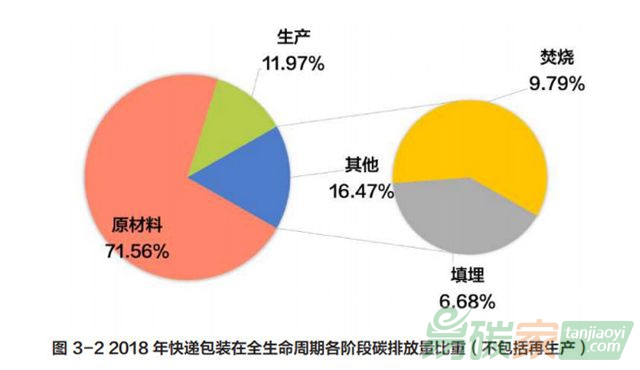 從圖 3-2 和圖 3-3 中可知,在 2018 年我國(guó)快遞包裝材料在生命周期各階段中(不包括再生),原材料階段(71.56%)的碳排放所占比重最大,處置階段占比重較小(焚燒 9.79%,填埋6.68%),生產(chǎn)階段(11.97%)占比最小。