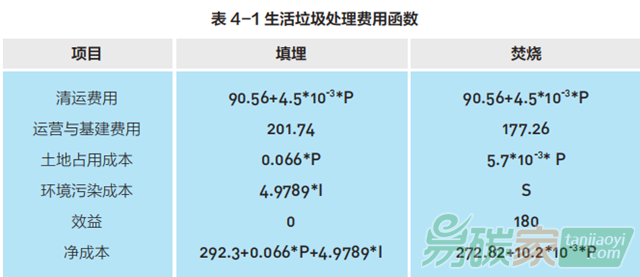 本文中的生活垃圾處置成本包括收集、運(yùn)輸、轉(zhuǎn)運(yùn)和處理成本,其中,垃圾處理相關(guān)費(fèi)用包括:垃圾清運(yùn)成本、運(yùn)營(yíng)和基建成本、土地占用成本、環(huán)境污染成本和效益,具體單位處理成本見表 4-1。垃圾填埋的環(huán)境成本包括垃圾填埋場(chǎng)主要的污染源——垃圾滲濾液的環(huán)境污染成本。焚燒處理的環(huán)境成本系通過(guò)疾病成本法來(lái)核算二噁英致癌成本。效益指垃圾焚燒發(fā)電收入;