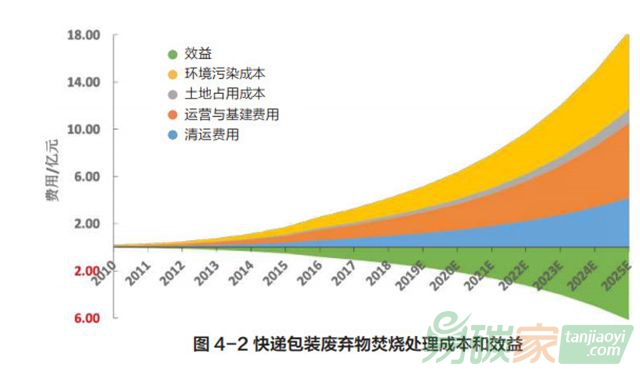 平均焚燒 1 噸快遞垃圾所需費(fèi)用 511 元,根據(jù)住建部發(fā)布的《中國(guó)城市建設(shè)統(tǒng)計(jì)年鑒》,2016 年我國(guó)生活垃圾填埋比例高達(dá) 60%,而焚燒比例為 38%,依此比例推算,2018 年快遞包裝焚燒量為 81.27 萬(wàn)噸,處理費(fèi)用也增至 4.15 億元。雖然生活垃圾焚燒發(fā)電產(chǎn)生了部分經(jīng)濟(jì)效益,但效益遠(yuǎn)低于成本。2018 年垃圾焚燒效益雖達(dá)到 1.46 億元,但凈成本也增長(zhǎng)到了 2.69 億。