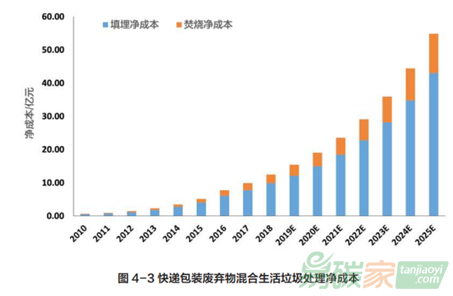生活垃圾社會(huì)管理成本是社會(huì)在生活垃圾管理各環(huán)節(jié)承擔(dān)的可識(shí)別的以市場(chǎng)價(jià)核算的成本。在中國(guó)特大城市中,快遞包裝垃圾增量已經(jīng)占到生活垃圾增量的 93%,部分大型城市則為 85% 至 90%??爝f包裝作為城市新增垃圾主力,不僅加大了環(huán)境承載壓力,也造成社會(huì)管理成本的增加。