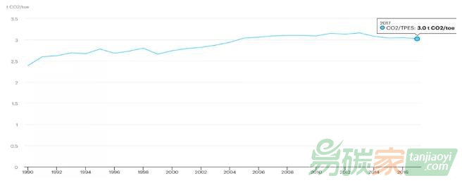 圖2: 中國(guó)能源系統(tǒng)的碳排放強(qiáng)度1990-2017,單位:tCO2/toe