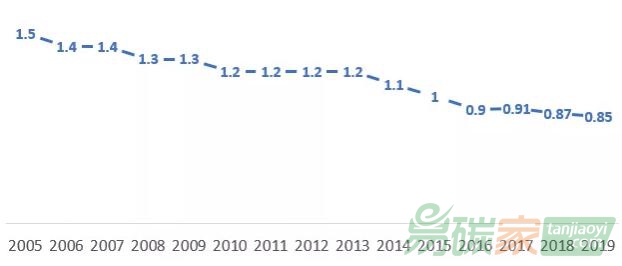 圖1:2005-2019中國(guó)單位GDP碳排放強(qiáng)度(單位:千克CO2/2010年不變價(jià)美元)