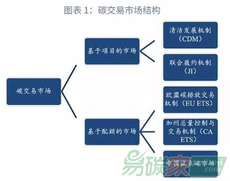 減排成本,2005年歐盟啟動(dòng)歐盟排放權(quán)交易機(jī)制(EU ETS),成為全球最早、發(fā)展最成熟的碳市場(chǎng)。據(jù)統(tǒng)計(jì),2018年全球已實(shí)施或計(jì)劃實(shí)施的碳定價(jià)計(jì)劃已達(dá)51個(gè),包括25個(gè)排放交易體系和26個(gè)碳稅制度。這些碳定價(jià)舉措將涵蓋110億噸二氧化碳當(dāng)量,占全球溫室氣體排放量的20%[1]。全球碳市場(chǎng)主要由配額市場(chǎng)和基于項(xiàng)目的市場(chǎng)兩部分構(gòu)成(如圖表1)。