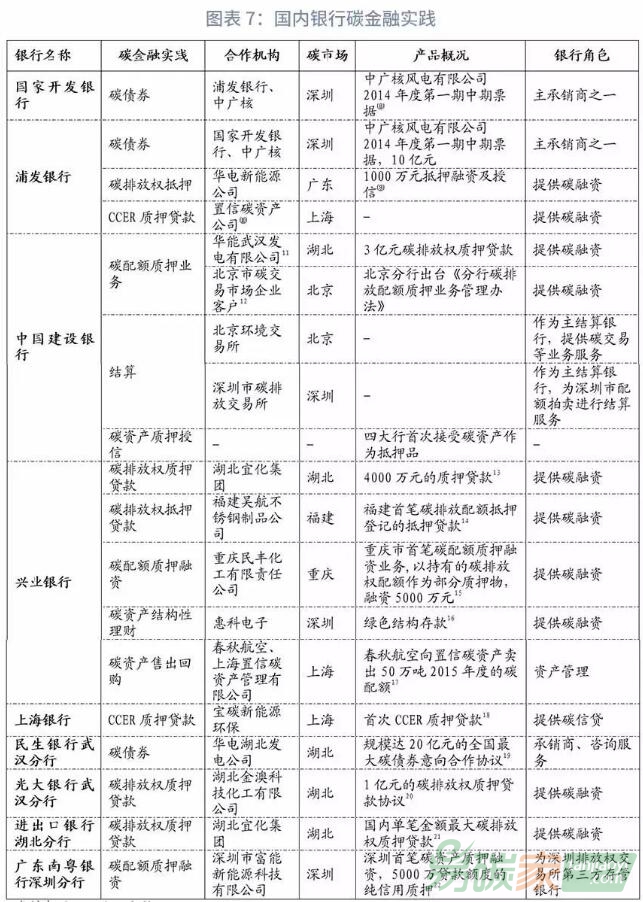 ccer質(zhì)押貸款、碳配額托管、碳資產(chǎn)管理、綠色結(jié)構(gòu)性存款等。我們將國(guó)內(nèi)銀行主要開(kāi)展的碳金融實(shí)踐匯總成圖表7。