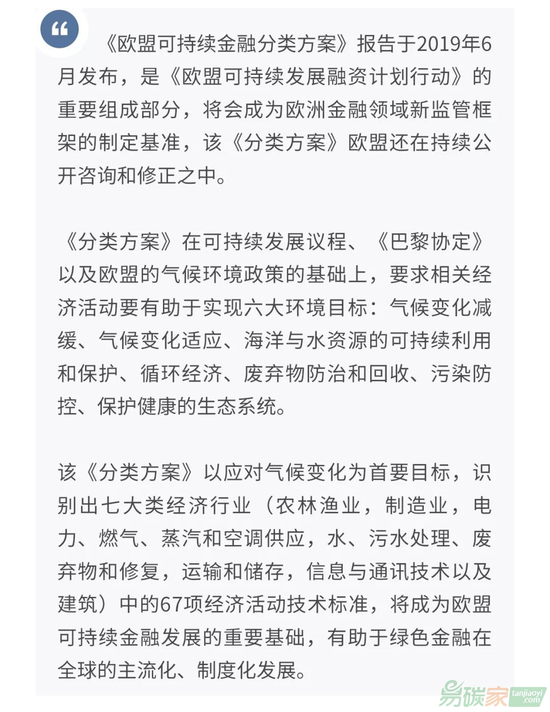 歐盟作為國際綠色金融領(lǐng)域積極推動和實(shí)踐的經(jīng)濟(jì)體之一,在2019年6月,歐盟委員會技術(shù)專家組連續(xù)發(fā)布《歐盟可持續(xù)金融分類方案》、《歐盟綠色債券標(biāo)準(zhǔn)》以及《自愿性低碳基準(zhǔn)》三份報(bào)告。其中長達(dá)400多頁的《歐盟可持續(xù)金融分類方案》將成為歐盟可持續(xù)金融發(fā)展的重要基礎(chǔ)。