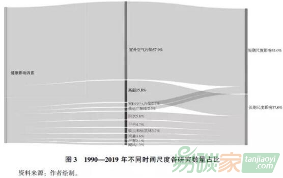從研究的空間尺度上看,關(guān)注國際尺度的研究占據(jù)了所有研究的35.6%,國家尺度的研究占比為40.0%,20.1%的研究涉及區(qū)域(次國家)尺度,只有4.3%的研究關(guān)注城市尺度;并且,區(qū)域(次國家)尺度以及城市尺度的研究大多是案例研究,而非全球或者全國范圍更精細(xì)分辨率的研究。從研究的時間尺度來看(見圖3),有63.0%的研究關(guān)注減排對人群健康的短期尺度影響,如室外空氣污染、核電廠輻射和室內(nèi)空氣污染等;剩余37.0%的研究關(guān)注的是氣候變化對人群健康的長期尺度影響,如高溫、干旱、洪水、蚊蟲和病原體、嚴(yán)寒、風(fēng)暴以及颶風(fēng)等。從研究的話題上看(見圖3),大部分研究集中于模擬減排通過提高室外空氣質(zhì)量對人群健康產(chǎn)生的直接影響,這主要是因為空氣污染這一話題備受關(guān)注,并且該研究的機(jī)理鏈條明確。關(guān)注高溫和水系統(tǒng)變化所帶來健康影響的文章分別占15.8%和10.5%,其他話題研究則相對分散,原因是這些研究在科學(xué)機(jī)理上還存在不明晰之處,所以難度較大。