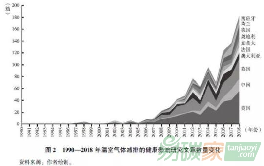 政策成本以及健康協(xié)同效應(yīng)的方法。從此之后,溫室氣體減排的健康協(xié)同效應(yīng)研究數(shù)量顯著增加,其中以美國、英國、澳大利亞和中國的研究機(jī)構(gòu)發(fā)表的文章最多(見圖2)。