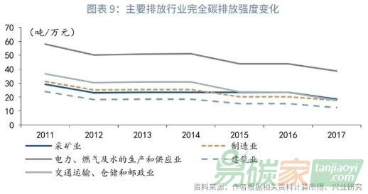 圖表9展示了碳排放強(qiáng)度較大的五個(gè)行業(yè)在2011年到2017年間的碳強(qiáng)度變化,均有一個(gè)下降的趨勢(shì),其中,2017年相較2011年完全碳排放強(qiáng)度下降較大的是