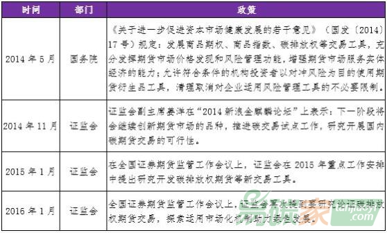 隨著碳現(xiàn)貨市場的逐步推進,碳金融市場也開始了逐漸的試點推進。在國家層面,國務(wù)院和證監(jiān)會陸續(xù)有如下表述: