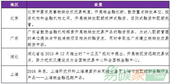 而在地方層面,一些試點地區(qū)對碳金融創(chuàng)新也持鼓勵態(tài)度,簡要摘錄如下: