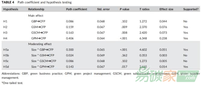 第一,作者分析了GP對CFP的影響,并研究了企業(yè)規(guī)模是否會緩和這種影響。研究發(fā)現(xiàn),GSM,GSCM和GPM對建筑公司的CFP產(chǎn)生了積極而顯著的影響。發(fā)現(xiàn)GPM對CFP的影響最大。這一發(fā)現(xiàn)凸顯了確保將GP集成到設計構(gòu)建的可持續(xù)性管理的重要性。