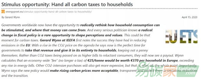 在EnergyPost.EU 網站發(fā)表署名 Gerard Wynn 的文章,題目是 Stimulus opportunity: Hand all carbon taxes to households(刺激經濟的機會:將所有碳稅收入分給家庭)。