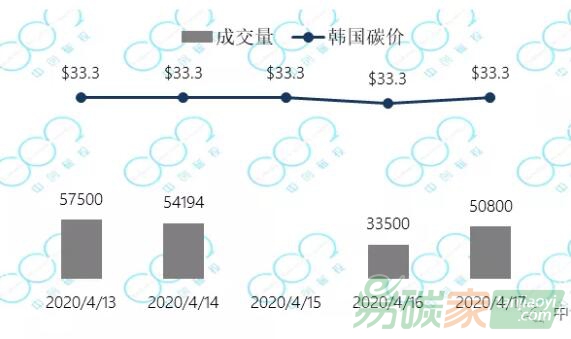 2020年4月13日至2020年4月17日,韓國(guó)碳價(jià)保持在33.3美元每噸。
