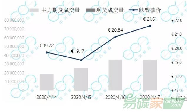 2020年4月13日至2020年4月17日,歐盟碳價(jià)持續(xù)反彈至21.61歐元每噸。相較一個(gè)月內(nèi)的最低點(diǎn)15.45歐元,已反彈上漲了40%。
