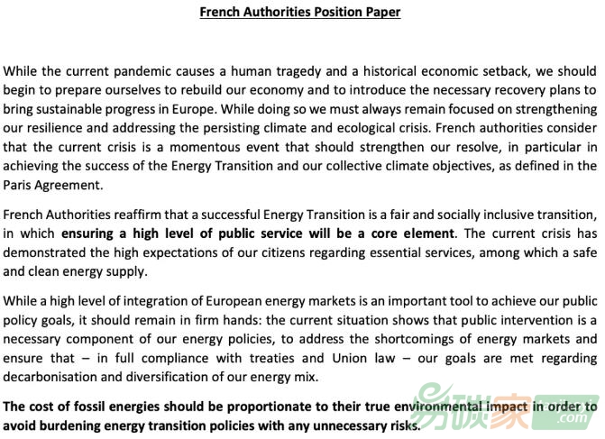市場上看到的“極低的化石燃料價格”并沒有反映出它們對氣候的真實成本。法國還擔心電價下跌對歐盟