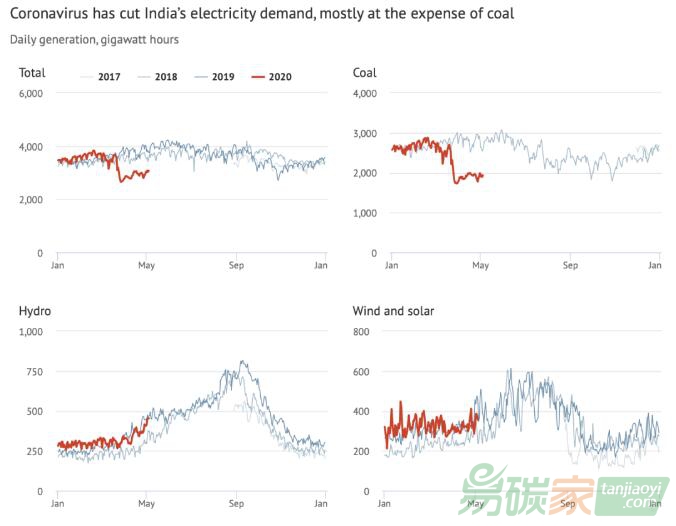 印度二氧化碳排放量的下降反映了自2019年初以來已經(jīng)影響印度經(jīng)濟(jì)的不利因素,以及可再生能源發(fā)電量的增加。此外,由于采取抗擊疫情的措施,3月份的二氧化碳排放降幅加大。