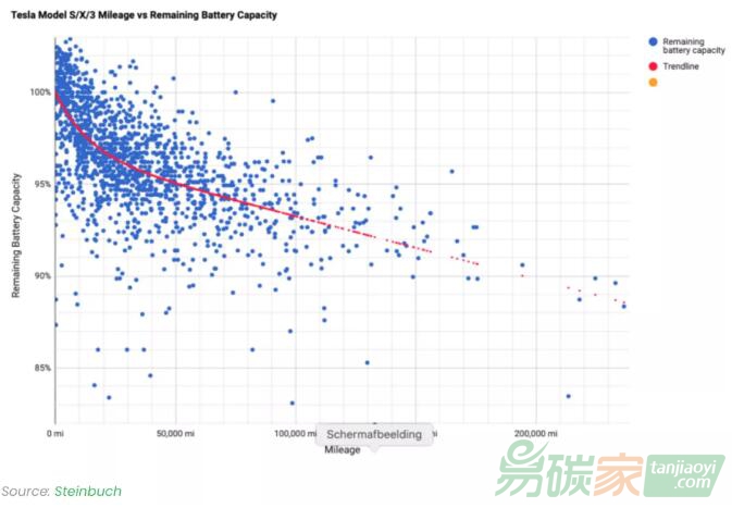在美國(guó),600輛特斯拉S型車(chē)總里程超過(guò)3700萬(wàn)公里,七年后電池的平均容量仍然在93%左右。而荷蘭特斯拉車(chē)主提供的數(shù)據(jù)顯示,汽車(chē)平均行駛超過(guò)28萬(wàn)公里,特斯拉電池的損耗不到其容量的10%。根據(jù)這些數(shù)據(jù)評(píng)估,大約行駛80000公里后,電池會(huì)損失5%的容量,但之后性能下降會(huì)變得更加線(xiàn)性;行駛近32萬(wàn)公里后電池容量會(huì)損失超過(guò)10%。