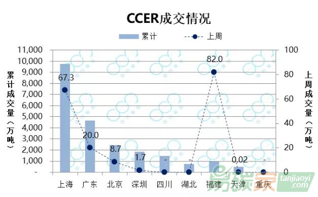 四川CCER累計成交量在1000-3000萬噸之間,分別占比10%左右;湖北、福建和天津市場交易量相對較小,在200-1000萬噸之間,占比均不到5%;重慶市場截至目前無成交。
