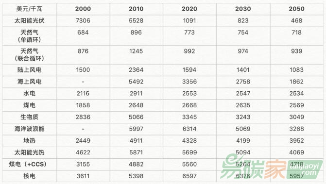 根據(jù)Energy Intelligence雜志匯總的數(shù)據(jù),2000-2020年各類發(fā)電技術(shù)裝機的投資成本(美元/千瓦)以及2030-2050年預(yù)測(以歐美裝機數(shù)據(jù)為基礎(chǔ)的均值,不計財務(wù)成本,2020年美元計)如下表所示: