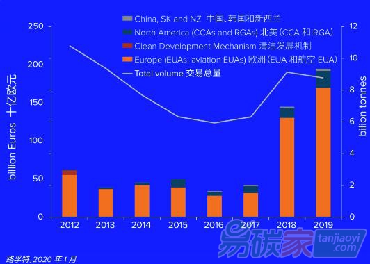 圖:2012 - 2019 年全球碳市場各個細分市場的交易價值、交易總量(圖表來源:路孚特碳市場年度回顧)