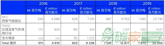 與2018年相比,北美兩個碳市場(西部氣候倡議(WCI)和區(qū)域溫室氣體減排行動(RGGI))的交易量和總體價值均實現(xiàn)增長,二者的總價值增長了74%,達到220億歐元。價格上漲是基于2021年信貸供給趨緊的預期,屆時兩個市場都將進入新的階段,并將出臺更多雄心勃勃的上限規(guī)定。