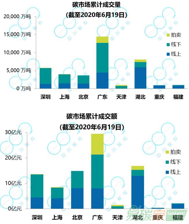 截至2020年6月19日,8個(gè)區(qū)域碳市場現(xiàn)貨累計(jì)成交3.88億噸,總成交額87.34億元。其中,廣東、湖北累計(jì)成交量與成交額最高,位于第一梯隊(duì);深圳、北京、上海成交量與成交額均位于第二梯隊(duì);天津、重慶、福建累計(jì)成交量與成交額位于第三梯隊(duì)。
