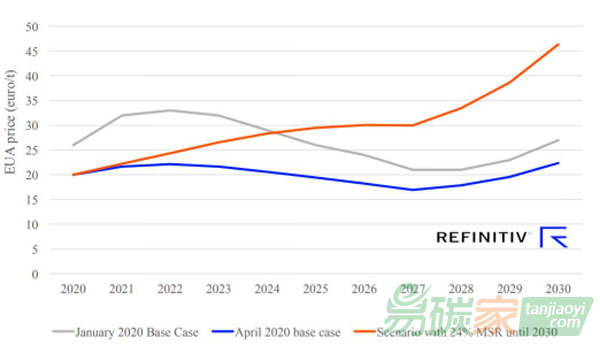 圖3 Refinitiv歐洲碳價預(yù)測,4月份基本場景以及MSR比例固定在24%的場景 (歐元/噸)