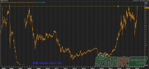 碳配額EUA價格連續(xù)攀升,先是在7月初突破年內(nèi)最高點(diǎn)26歐元,又在7月13日飆升突破30歐元關(guān)口。12月份到期的EUA Dec-20期貨在日內(nèi)交易最高價達(dá)到了30.80歐元每噸,這是自2006年以來的最高點(diǎn)。這一價位也僅僅略低于2006年4月份的歷史最高碳價31歐元。