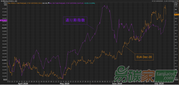 碳價持續(xù)攀升的走勢之下,也有隱憂。近幾個月來碳價和全球各大股指尤其是美股的相關(guān)性非常高。這一方面是由于經(jīng)濟(jì)復(fù)蘇信心推動,另一方面也是因為各國央行的低利率和經(jīng)濟(jì)刺激措施,增加了金融市場的資本流動,同時使得機(jī)構(gòu)投資者在碳市場所占份額有所上升,交易活動更加活躍。如下圖4所示,第二季度以來,美國道瓊斯指數(shù)也是節(jié)節(jié)攀升,和碳價走勢十分相似,在有些時段,兩者的相關(guān)性高達(dá)0.8 以上。影響股市后期走勢的因素繁多,難以預(yù)料,但是如果碳價繼續(xù)保持和股指如此高的相關(guān)性,一旦股市因為比如經(jīng)濟(jì)復(fù)蘇緩慢或者’第二波’ 疫情的擔(dān)憂加劇而下跌,那么也有可能帶動一些金融資本撤離碳市場,給碳價帶來一定的回調(diào)風(fēng)險。