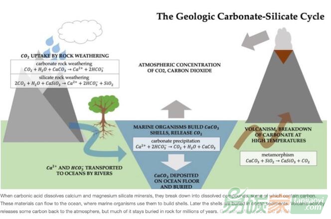 地球表面的巖石會(huì)受到受化學(xué)、生物、氣候和板塊構(gòu)造的影響,當(dāng)二氧化碳與土壤和海洋中的水結(jié)合生成碳酸時(shí),就出現(xiàn)了化學(xué)風(fēng)化。大約95%的地殼和地幔(地殼和地核之間的厚層)是由硅酸鹽礦物構(gòu)成的,是大多數(shù)火成巖的主要成分,當(dāng)火山物質(zhì)冷卻和硬化時(shí)形成,這些巖石占地球陸地表面的15%。