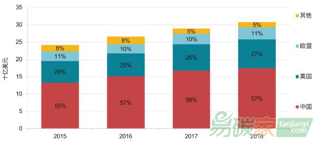注:圖表結(jié)果基于2018年面向各ESCO協(xié)會(huì)、國際機(jī)構(gòu)和專家開展的一系列調(diào)查和訪談,以及案頭研究。由于可用數(shù)據(jù)有限,2018年美國的增長為估算數(shù)據(jù)。