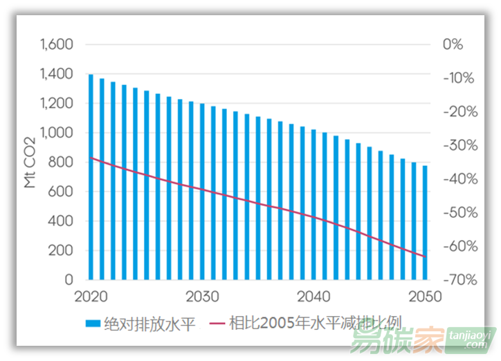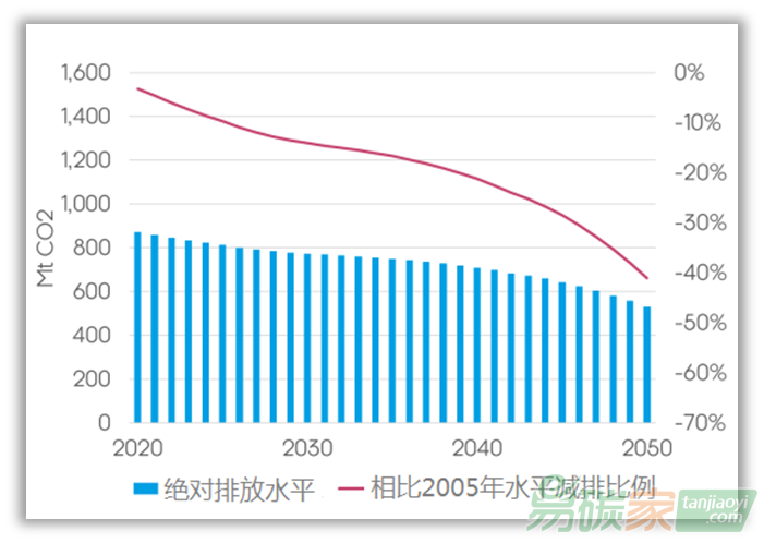 到2030年公路交通排放預(yù)計將比2005年水平低14%左右;而建筑物(主要為采暖)排放將比2005年水平低34%。到2050年公路交通和建筑排放預(yù)計分別低于2005年水平的37%和41%,絕對CO2排放分別略高于5.5億噸和4億噸。