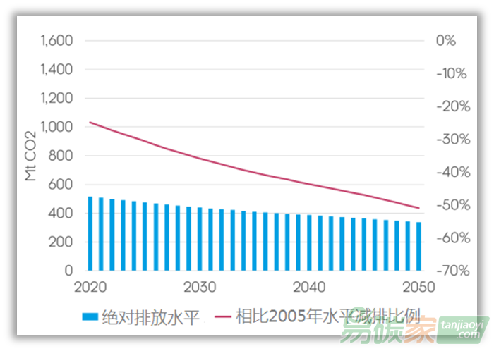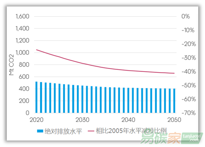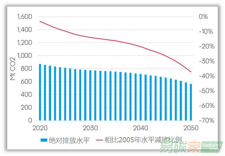 2050年也將出現(xiàn)類似情況:為彌補交通和建筑物減排的不足,現(xiàn)有ETS納管行業(yè)的排放量需減少73%,以實現(xiàn)ETS排放量與2005年相比減少63%的整體目標(biāo)。