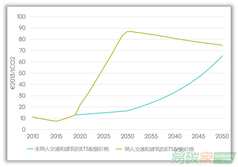 將公路交通和建筑物納入ETS機制后,若要實現(xiàn)ETS目標(biāo)所需的減排量(即2030年排放量比2005年水平低43%,2050年排放量比2050年低63%),則需要比當(dāng)前ETS更高的配額價格,這勢必對現(xiàn)有ETS納管行業(yè)的競爭力產(chǎn)生影響。