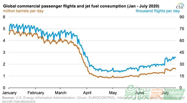 據(jù)美國(guó)能源信息署的數(shù)據(jù),新冠毒病的蔓延極大地改變了全球商業(yè)航班的客運(yùn)量。全球在1月和2月平均每天超過(guò)7萬(wàn)個(gè)航班,4月份下降到平均每天不到2.5萬(wàn)個(gè)航班,5月份以來(lái)又開(kāi)始增加??瓦\(yùn)
