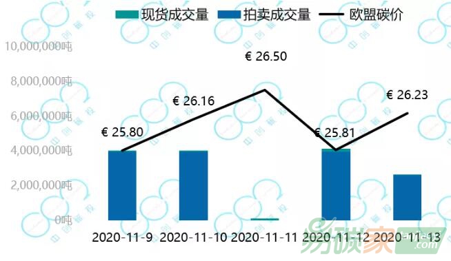 2020年11月9日至11月13日,歐盟碳價周漲幅3%,截至周五報收于26.23歐元每噸。