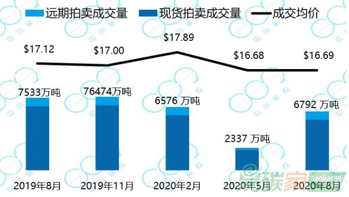 加州-魁北克碳市場的初始配額發(fā)放以拍賣為主,每個季度舉行一次拍賣。2020年拍賣基價設(shè)定于16.68美元,比去年提高了7%。受疫情影響,美國大量企業(yè)停工,第二季度配額拍賣成交慘淡,拍賣成交量僅為供應(yīng)量的35%。第三季度拍賣恢復(fù)了活躍,90%的拍賣量得以成交,以16.69美元每噸的均價成交了6792萬噸。第四季度拍賣計劃于11月17日舉行。