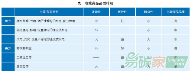 由于電能難以大量儲存,發(fā)用功率需要實時平衡,從對電力系統(tǒng)調度運行和功率平衡的影響,筆者認為電能商品品質應從(波動性、可控性、隨機性)3個維度進行衡量(見表)。其中波動性指功率相對于自身容量的變化幅度;可控性指將功率在一定范圍內自由調節(jié)的難易程度;隨機性與可控性有一定的關聯(lián),隨機性大的電源或負荷一定難于控制,而隨機性小的電源或負荷可能易控(可靈活調節(jié)的資源),也可能難控(功率相對固定的資源)。對當前各類常見供方(電廠)所生產和需方(負荷)所消費的電能商品品質可以給出表中所示的排級。注意這里是對電能商品的品質進行排級,而非給電源或負荷“貼標簽”,僅按一般情況依照電能商品品質高低對電源和負荷進行大致分類,而具體情況需要具體分析。例如,如果品質一般的煤電經過靈活性改造,可升級為高品質的調峰電源。需要說明的是,電能商品品質是從保證電力系統(tǒng)發(fā)用功率平衡的角度來定義的,因此對于電能商品的供方(生產者)和需方(消費者),商品品質的價值內涵是不同的。從定價原則來講,對于供方,電能商品品質越高,定價越高;對于需方,電能商品品質越高,定價越低(即價格越優(yōu)惠),甚至可以享受負電價。也就是說,供方所生產的低品質電能商品(如風電)可以較低價提供需方的高品質電能商品消費(如需求側響應),反之亦然。