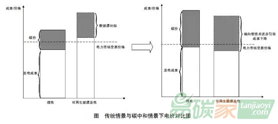 電力市場(chǎng)交易價(jià)格的對(duì)比。左圖代表在傳統(tǒng)情景下,煤電發(fā)電比例較大。可再生能源發(fā)電價(jià)格高于煤電,即使政府實(shí)施新能源補(bǔ)貼