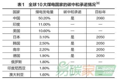 目前已有大量國(guó)家做出碳中和承諾。截至2020年10月,碳中和承諾國(guó)達(dá)到127個(gè),這些國(guó)家的溫室氣體排放總量已占到全球排放的50%,經(jīng)濟(jì)總量在全球的占比超過40%,并且全球十大煤電國(guó)家中的5個(gè)已做出相應(yīng)承諾(表1),這些國(guó)家的煤電發(fā)電量在全球的占比超過60%。作為碳排放大國(guó)和煤電大國(guó),中國(guó)的碳中和承諾無疑為提升碳中和行動(dòng)影響力,提振全球氣候行動(dòng)信心做出了重要貢獻(xiàn)。