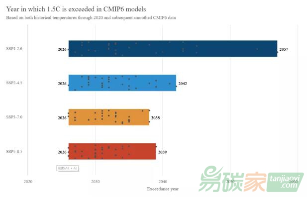 結(jié)果顯示,在所有的CMIP6模型下,全球氣溫都預(yù)計(jì)將要超過1.5℃限值,條形圖表示某一特定SSP方案的“超越數(shù)”日期的全部范圍,黑點(diǎn)則表示所有個(gè)別模型的估計(jì)值。