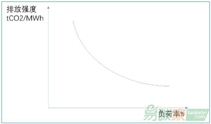 假設(shè)入爐煤低位發(fā)熱量、入爐煤含碳量和入爐煤燃燒氧化率不隨負荷變化,那么可以得到供電排放強度和負荷率的關(guān)系圖: