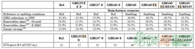 節(jié)能目標(biāo)和補(bǔ)貼等政策手段來促進(jìn)碳減排。根據(jù)歐盟2014年開展的研究顯示。在2030年同樣的減排雄心下,碳市場的預(yù)測價格在沒有成員國節(jié)能和可再生能源目標(biāo)下為53歐元,倘若設(shè)立了約束性的30%節(jié)能目標(biāo)和30%可再生能源目標(biāo),碳市場配額價格僅為11歐元(如表1所示)。碳