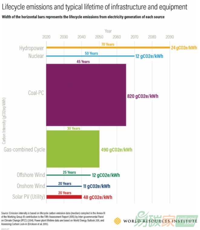電力公司需要建設(shè)新的發(fā)電廠以滿足不斷增長的電力需求,那么最終投建的電廠類型將帶來截然不同的排放結(jié)果。如下圖所示,即便假設(shè)每個發(fā)電廠每年在其各自的生命周期內(nèi)能提供相同數(shù)量的電力,不同類型的發(fā)電廠所帶來的排放量也有顯著差異。以單位發(fā)電量產(chǎn)生的溫室氣體排放為例,一座預(yù)期使用壽命為50年的核電站,每千瓦時僅產(chǎn)生 12克溫室氣體 排放(gCO2e/kWh),而一座預(yù)期使用壽命為45年的化石燃煤電廠將產(chǎn)生前者68倍的溫室氣體排放 (820 gCO2e/kWh)。同樣,一座使用壽命為30年的天然氣聯(lián)合循環(huán)發(fā)電廠的排放量 (490 gCO2e/kWh) 是一座壽命為25年的海上風(fēng)電設(shè)施的40倍以上 (12 gCO2e/kWh)。