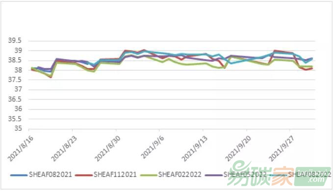 本報告期內(nèi)(2021年9月22日至2021年9月24日),上海碳配額遠(yuǎn)期(SHEAF)中央對手清算業(yè)務(wù)保持平穩(wěn)運(yùn)行。本周遠(yuǎn)期市場價格整體小幅下滑,其中2021年11月協(xié)議期末結(jié)算價為38.09元/噸,較上周五9月24日下跌0.91元/噸,2022年2月協(xié)議期末結(jié)算價38.20元/噸,較上周五9月24日下跌0.34元/噸。