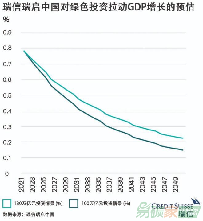 瑞信預(yù)計,要實現(xiàn)2060年凈零排放目標(biāo),未來30年中國需要投資約100-130萬億元用于發(fā)展以綠色基礎(chǔ)設(shè)施為主的綠色項目。如此大規(guī)模的投資有望為中國的國內(nèi)生產(chǎn)總值(GDP)提供新的增長引擎,并由此帶來新的商業(yè)機會和優(yōu)質(zhì)就業(yè)崗位。把 “