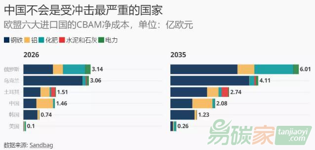 一旦將售價(jià)提高而增加的收入考慮進(jìn)去,俄羅斯因CBAM而增加的“凈”成本就會(huì)低得多,2026年為3.13億歐元,2035 年為 6.02億歐元。在所有估算中,美國(guó)都是受影響最小的國(guó)家,根據(jù)當(dāng)前的監(jiān)管提案,其2026 年的凈成本僅為 1000萬(wàn)歐元,2035年的凈成本為 2500萬(wàn)歐元。總體而言,與歐盟直接相鄰的國(guó)家受CBAM的影響似乎最大。