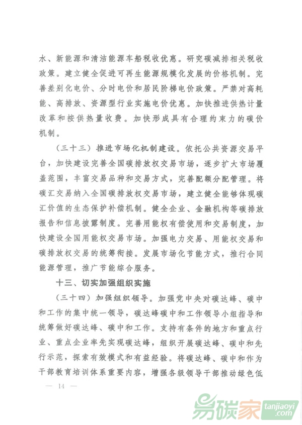 (三十四)加強組織領導。加強黨中央對碳達峰、碳中和工作的集中統(tǒng)一領導,碳達峰碳中和工作領導小組指導和統(tǒng)籌做好碳達峰、碳中和工作。支持有條件的地方和重點行業(yè)、重點企業(yè)率先實現(xiàn)碳達峰,組織開展碳達峰、碳中和先行示范,探索有效模式和有益經(jīng)驗。將碳達峰、碳中和作為干部教育培訓體系重要內(nèi)容,增強各級領導干部推動綠色低碳發(fā)展的本領。