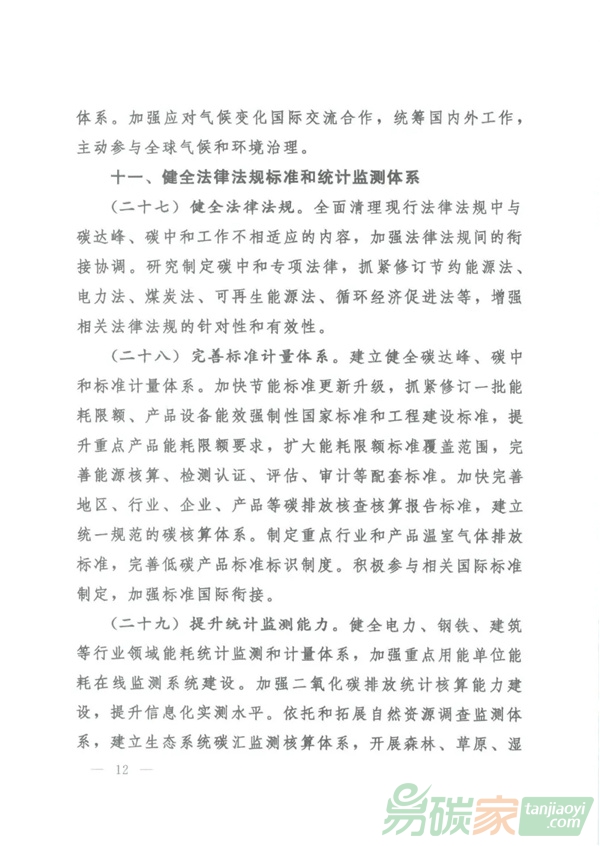 (二十七)健全法律法規(guī)。全面清理現(xiàn)行法律法規(guī)中與碳達峰、碳中和工作不相適應的內(nèi)容,加強法律法規(guī)間的銜接協(xié)調(diào)。研究制定碳中和專項法律,抓緊修訂節(jié)約能源法、電力法、煤炭法、可再生能源法、循環(huán)經(jīng)濟促進法等,增強相關法律法規(guī)的針對性和有效性。